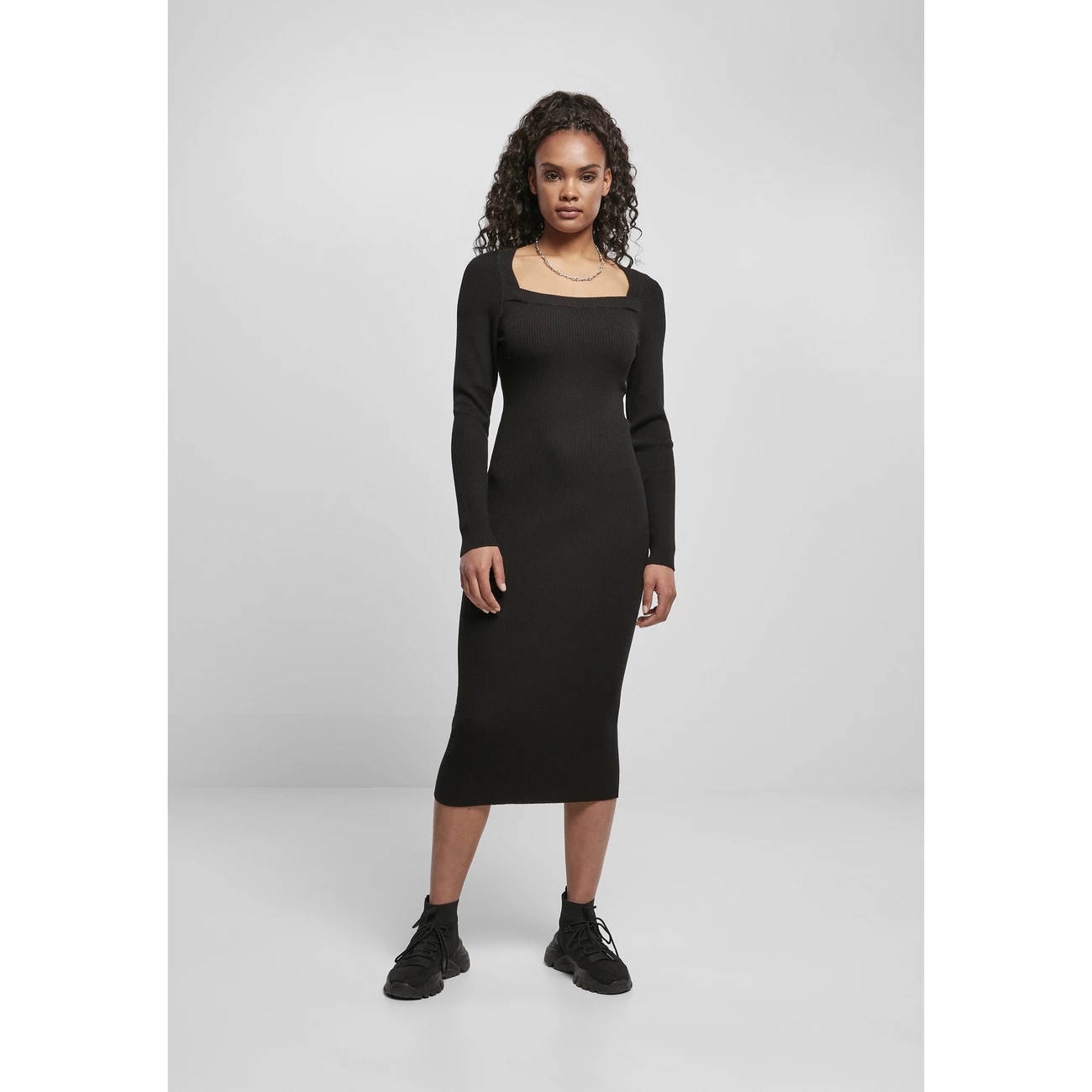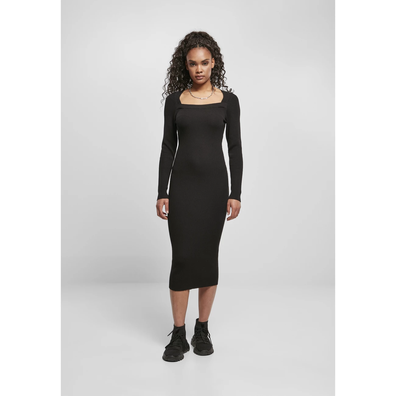 La robe a des manches longues et se termine sous les genoux. Matière: 35 % acrylique, 35 % viscose, 30 % nylon. Côte 2×2, 245 gsm.